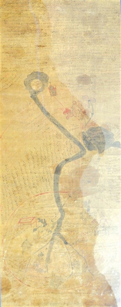 根据作者生平推测,这幅古经字画大约书成于清乾隆十七年(1752)至嘉庆十七年(1812)之间,迄今约有260年的历史。经字画高155厘米、宽56厘米,用三种文字消经、阿拉伯文和波斯文书写在宣纸上,以红色和黑色两种颜色写就。这幅古经字画顶部为“九层天空”图案,字迹清晰,色彩鲜明,并绘有花木、房舍等图案,全幅字和画布局相辅相成,画中的一棵大树,树根发达,寓意深植祖国大地;树干挺拔,枝繁叶茂,居于其中,组成了完整的构图,具有浓郁的东乡族穆斯林风格,极具文化象征意义。