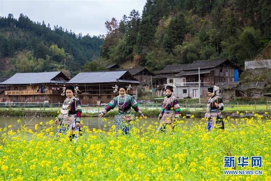 1月10日,在榕江县扒王侗寨,穿着盛装参加踩歌堂迎新年的侗族姑娘走过一片油菜花地。当日是贵州省榕江县扒王侗寨侗族大年初一,当地侗族同胞伴随着侗族歌师弹奏的琵琶歌,欢乐踩歌堂,迎接侗族新年的到来?!安雀杼谩笔嵌弊寮漓肷窳?,祈求人畜兴旺、五谷丰收的盛大集体活动。新华社发(黄万鑫 摄)