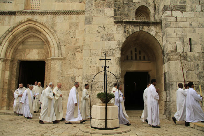 复活节时,叙利亚东正教大主教Mar Malki Murad在耶路撒冷老城的圣马可教堂内主持濯足节仪式。 图片来源:Hanan Isachar