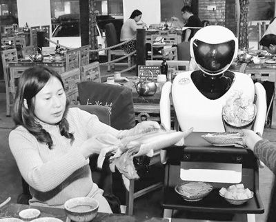 山东省东营市首个餐饮机器人服务员正在为客人上菜。