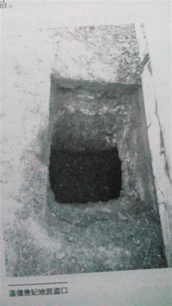 根据徐鑫在书中的表述,盗洞位于温僖贵妃宝顶西侧月台下,洞口被盗墓者用草木掩盖。据书中现场图片显示,盗洞长1米、深1米左右,切口工整。