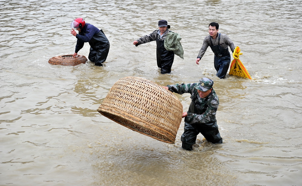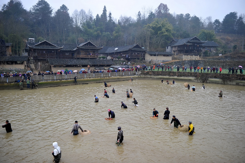 1月13日,张家界市砂子垭村举行“鸡笼罩鱼”比赛,人们拿着竹篾编织成的鸡笼,下到膝盖深的水塘里进行捕鱼?!凹α钟恪笔堑钡胤昴旯诘囊幌畲诚八祝耐凶湃嗣瞧砼文昴暧杏?,五谷丰登的愿望。新华社发(邵颖 摄)