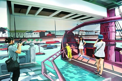 广东省博物馆“牵星过洋”展在地铁里设置的3D海上丝绸之路码头场景画,颇受欢迎。魏竣摄