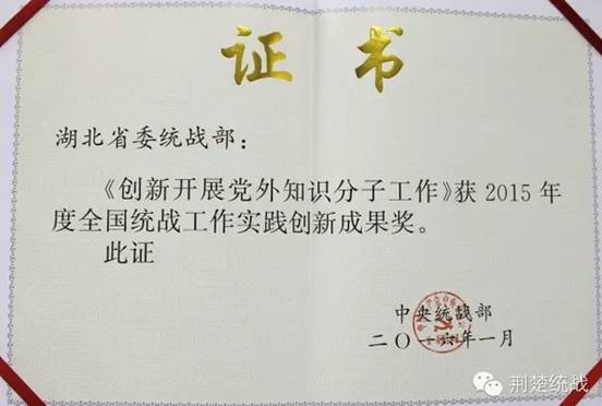 “湖北创新开展党外知识分子工作”被评为全国统战工作实践创新成果奖。