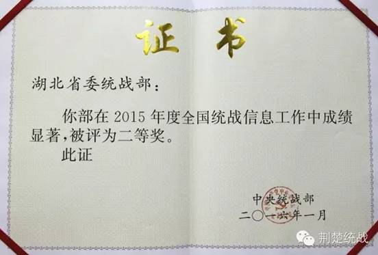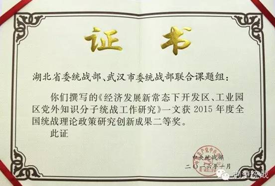 在2015年度全国统战理论政策研究创新成果中,湖北省委统战部和武汉市委统战部联合撰写的《经济发展新常态下开发区、工业园区党外知识分子统战工作研究》被评为二等奖,省委统战部撰写的《关于加强专业人士统战工作的调查与思考》、省社会主义学院撰写的《以章治党:法治视野下的民主党派建设之路径探析》、中国统战理论研究会党外知识分子统战工作湖北研究基地和省委统战部联合撰写的《“塔西佗陷阱”与自媒体时代党外知识分子工作策略研究》三篇文章被评为三等奖。