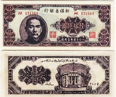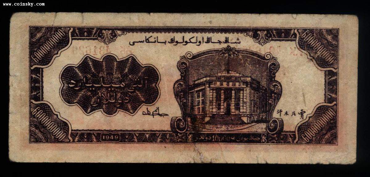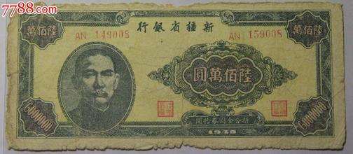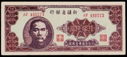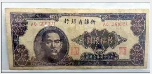 这枚巨额纸币正面上方有“新疆省银行”字样,左边是孙中山头像,右边有“陆拾亿圆”字样,同时,币面下方还有“折合金元券一万元”一行大字。一枚纸币上并列有两种不同的货币单位和金额,这在中国货币史上也是绝无仅有的。