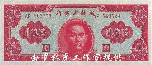 前段时间,笔者到杭州世界钱币博物馆华侨馆参观,展馆里的一张民国时期新疆省银行发行的面值为60亿元的纸币引起了笔者的极大兴趣。它堪称中国货币史上最大面额的纸币。于是,笔者特查阅了相关资料,让大家也来认识和了解一下这张带有神秘色彩的纸币。(见下图)