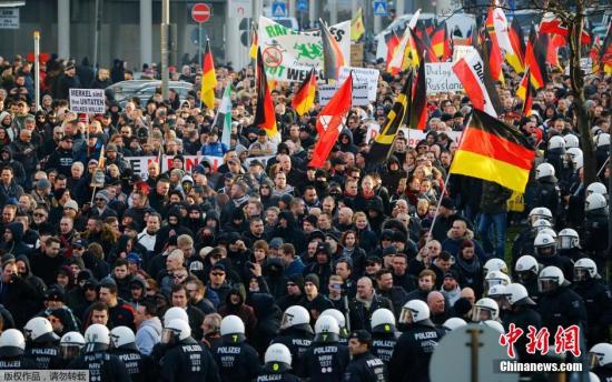 资料图:德国爆发反移民示威。示威者还以德国总理默克尔为抨击目标,指控她透过自己对难民的自由立场,任由难民在德国横行。