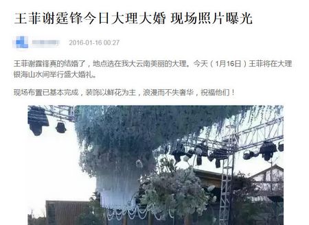 中新网1月16日电 近日,网曝王菲与谢霆锋将于16日在大理举办婚礼,今早更有所谓“大婚现场图”流出。对此,谢霆锋经纪人霍汶希第一时间发微博辟谣:“太无聊了,霆锋今天还在上海拍摄蜜锋少女”。