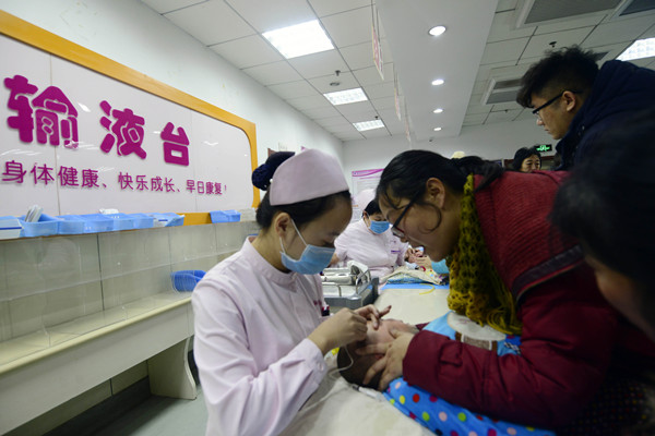 冬季是呼吸道感染疾病的高发季节,近期济南持续的雾霾天气更是导致呼吸道疾病的小患者骤增。连日来,前来济南妇幼保健院输液的患儿日均超过400人,门诊量日均达到900人次。治疗这些对自身病情难以准确描述的小患者,更需要医务人员与家属的沟通、理解与信任。图为在济南市妇幼保健院输液大厅,医护人员为小患儿输液。新华社发