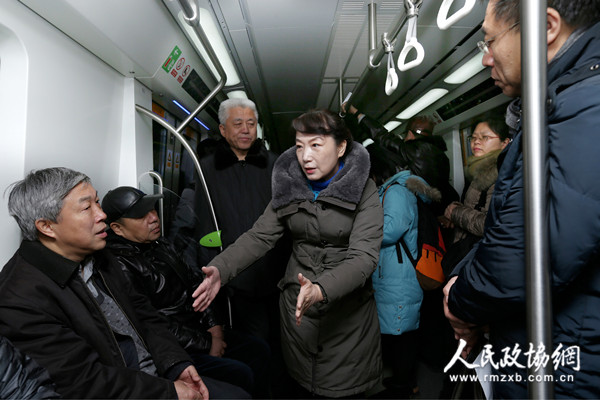 1月14日,北京市政协城建环保委员会委员对地铁14号线进行视察,了解轨道交通设备设施和运营状况。图为委员实地了解轨道交通运行情况。齐波摄