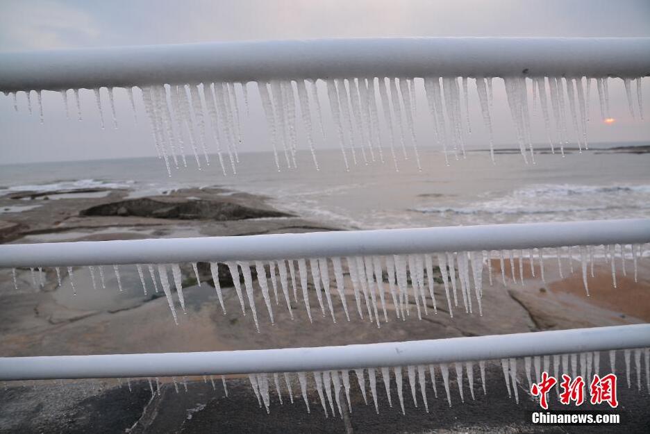 2016年1月18日,山东省日照市,海边出现冰凌景观。当日是农历“四九”第一天,山东省气象局发布天气预报:山东半岛地区北风5~6级阵风7级,夜间最低气温半岛内陆地区-10~-12℃。受冷空气的影响,日照市沿海浅滩出现零星冰碴和冰凌,均以初生冰和冰皮为主,未对海洋养殖和渔船作业带来影响。 图片来源:视觉中国