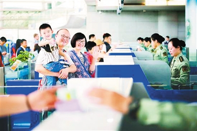 一个参加出境游的中国家庭正在办理边检通关手续