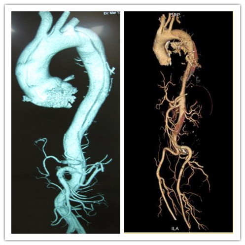 图1:A型主动脉夹层累及全主动脉 图2:B型夹层累及降主动脉以远