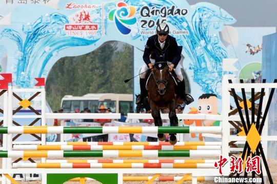 资料图:2015年9月18日,青岛2015世界休闲体育大会马术公开赛启幕。图为选手正在进行障碍赛比赛。大会组委会供图