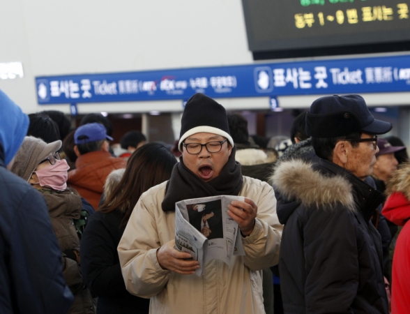 1月19日,在韩国首尔火车站,一名旅客在排队购票时看报纸打发时间。新华社记者姚琪琳摄
