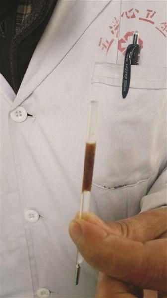 医护人员从嵇老汉体内取出的体温计。贾亮 摄