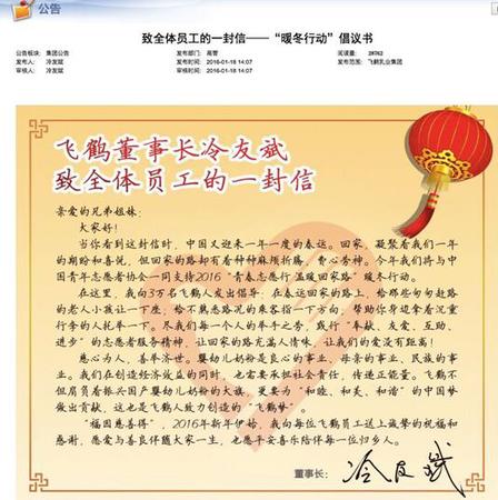 1月18日,全国劳动模范、飞鹤乳业董事长冷友斌发布内部信,号召3万员工投身春运公益活动,“尽举手之劳 让爱没有距离”。据飞鹤内部员工透露,倡议信提到,此次飞鹤将与中国青年志愿者协会一同支持2016“青春志愿行 温暖回家路”暖冬行动,并号召飞鹤全体员工在春运期间投身全国各大交通枢纽,为有需要的人提供无偿帮助,用一个微笑、一把扶助、一次指路等点滴善举,让回家的路充满人情味。