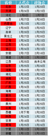 资料来源于各省日报及人大、政协网站,内容截至1月20日,实际时间以当地会议召开时间为准(图中灰色为已闭幕省份,红色为本周将开会省份)