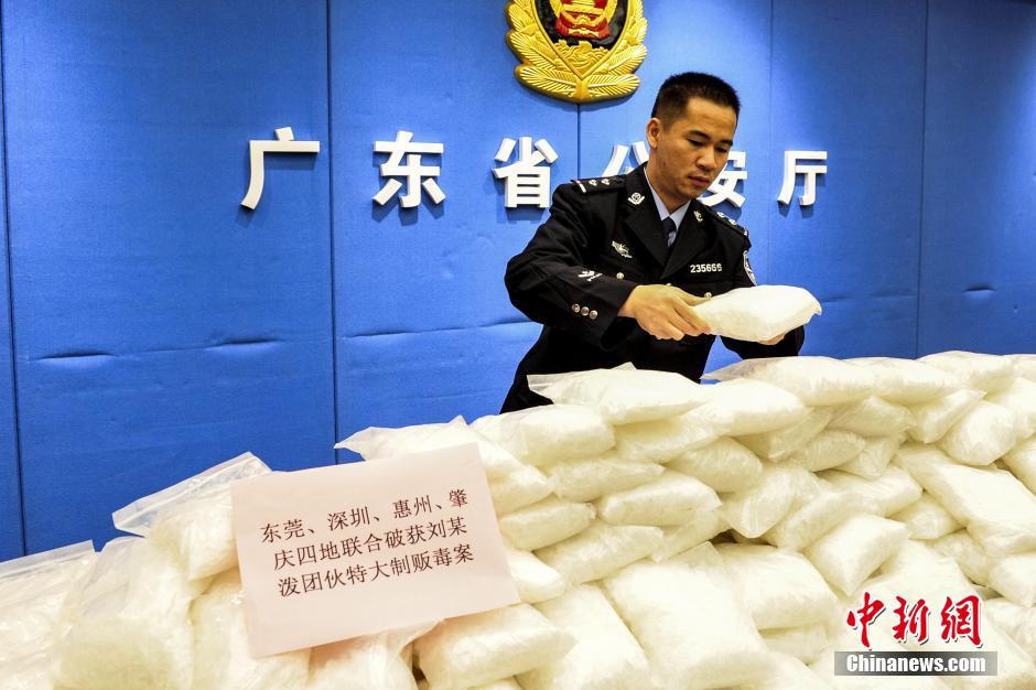 1月19日,广东省公安厅通报,2015年12月,广东东莞、深圳、惠州、肇庆警方成功侦破一起特大制贩毒品案,抓获犯罪嫌疑人32名,摧毁位于肇庆四会市的制毒工厂1个,缴获冰毒1.09吨,固态混合物冰毒半成品1.21吨。中新社记者 陈骥旻 摄
