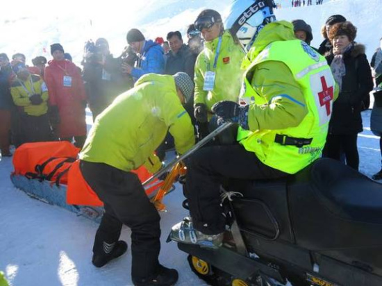 新华社乌鲁木齐1月21日电 索契冬奥会自由式滑雪女子空中技巧亚军、8号徐梦桃在第十三届全国冬季运动会自由式滑雪空中技巧女子个人决赛落地时意外摔伤,急救人员已入场将其抬走,希望这位国家队主力伤情无碍!新华社记者杜刚拍摄