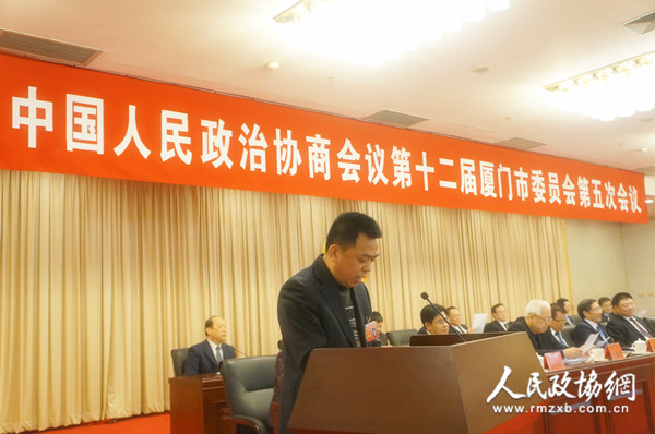 1月20日,在厦门市政协十二届五次会议的大会发言上,陈育斌委员代表农工党厦门市委发言,题为《关于打造品牌优势 做好闽南文化产业开发的建议》。照宁 摄