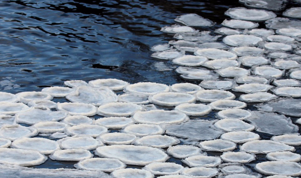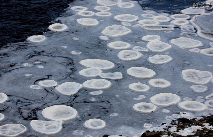英国《每日邮报》报道中的照片显示,冰块被冻成了平底的、圆形的形状,尺寸跟餐盘一般大。这种特殊的形状是由漂浮在河流上的旋转泡沫冻结而成的。