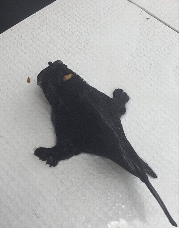 新西兰一对渔民夫妇日前在北岛附近海域捕捉到一条形如黑色青蛙的怪鱼,图片引发网友热议,有人认为怪鱼更像外星生物。