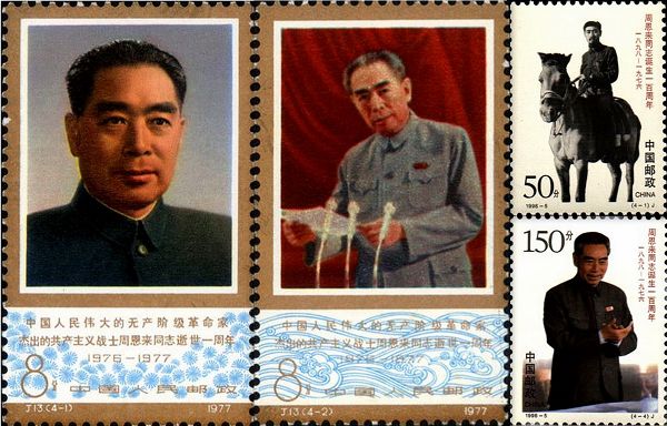 1998年3月5日,我国发行的《周恩来同志诞生一百周年》纪念邮票,全套4枚,各枚都有他的画像,面值共400分。这套邮票由范阳、时卫平设计,邮票图名分别为“军事家”、“开国总理”、“外交家” 和“人民公仆”,图案选自周恩来同志在各个不同时期的珍贵影像。