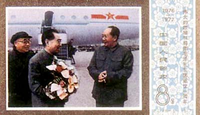 1977年9月9日,我国发行J21《伟大的领袖和导师毛泽东主席逝世一周年》纪念邮票全套6枚,发行量3000万套,由刘硕仁设计,影写版印刷。其中第五枚“毛主席和他的亲密战友周恩来同志、朱德同志在一起”,图案取自1964年11月,周总理率团参加前苏联十月革命47周年活动后,回到北京西郊机场时,毛泽东主席等前往迎接时的一幅新闻照片。这套邮票也曾被评为建国三十年最佳邮票。