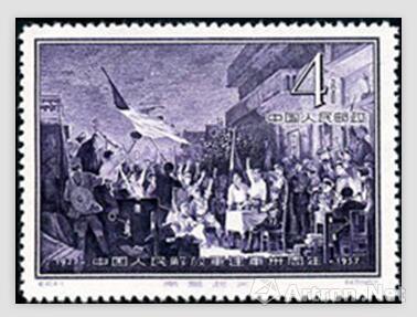 新中国首枚出现周总理光辉形象的邮票,是1957年8月原国家邮电部发行的《中国人民解放军建军三十周年》纪念邮票,其中第一枚“南昌起义”(图1),展现了周恩来等同志正在发动和组织武装起义时的历史镜头。1959年10月1日,新中国发行了《中华人民共和国成立十周年(第五组)》纪念邮票一套1枚,这枚名为《开国大典》的邮票由董希文、唐霖坤设计,图案中周恩来同志和其他开国元勋站在天安门城楼上,见证了共和国成立这一伟大历史时刻。