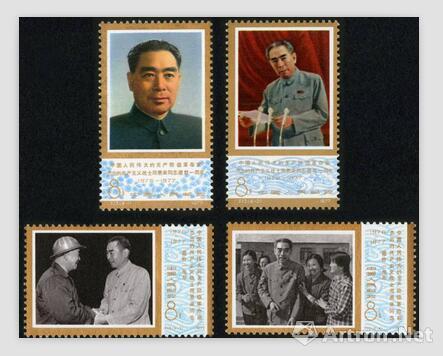 为表达对周恩来总理的深切怀念和崇高敬意,1977年1月8日,原国家邮电部发行了J13《中国人民伟大的无产阶级革命家、杰出的共产主义战士周恩来同志逝世一周年》纪念邮票一套4枚(图2),该套邮票图案均取材于历史照片。这是我国第一套为领袖人物发行的纪念邮票。