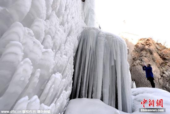 1月19日,北京昌平区德胜口水库冰挂高大震撼,垂冰似利剑。垂冰似“利剑”游人仰头拍不停。 图片来源:东方IC