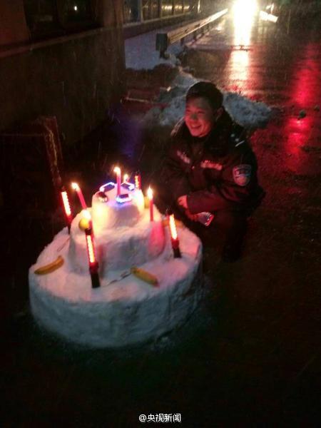 关键词:雪蛋糕 浙江雪中执勤交警 雪蛋糕庆生