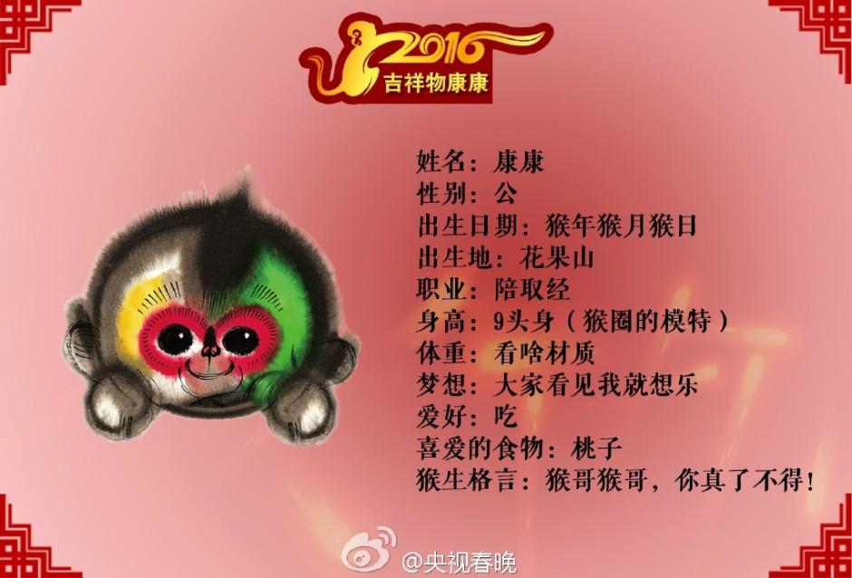 21日据央视春晚官方微博报道,2016猴年春晚吉祥物“康康”正式发布啦!“康康”由国家一级美术师、北京奥运会吉祥物“福娃”的创作者韩美林设计,以中国传统水墨画的艺术形式,生动表现出“猴”的机灵活泼特点。作为春晚历史上第二任吉祥物,它将以怎样的方式出现在今年春晚的舞台现在尚在保密中。 图片来源:央视春晚官方微博