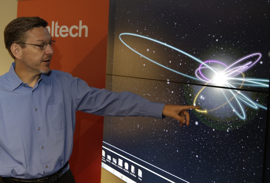 1月20日,在美国加利福尼亚州帕萨迪纳,加州理工学院天文学家迈克尔·布朗站在计算机模拟的行星运行轨道前?!摆ね跣巧笔帧甭蹩硕げ祭?0日发表文章说,第九大行星回来了。这一次不是要拯救已被从太阳系九大行星中除名的冥王星,而是天文学家新发现了太阳系中可能存在第九大行星的证据,并称这颗被昵称为“行星九”的行星与太阳之间的距离超过冥王星和太阳之间的距离。美国加州理工学院天文学家布朗和康斯坦丁·巴特金20日在美国《天文学杂志》上发表论文称,尽管尚未直接观测到这颗行星,但他们已通过数学建模和计算机模拟找到了太阳系存在“行星九”的“铁证”。