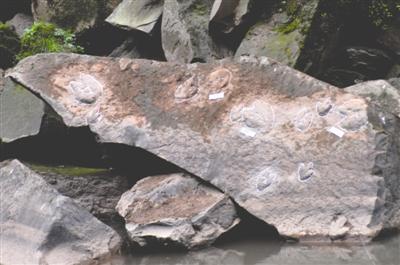 2015年秋天,桂花河汛期过后,徐挺来到河畔足迹点进行查看。徐挺介绍,自己先查看了几处比较常规的恐龙足迹,随后在一处落石上发现了好几个有些奇怪的脚印,最大的一个长度超过25厘米。“这些足迹呈椭圆形,有两个尖尖的脚趾,感觉有点像牛羊等偶蹄类动物踩下的?!毙焱λ?。