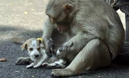 关键词:猴子收养流浪小狗 印度猴子收养小狗