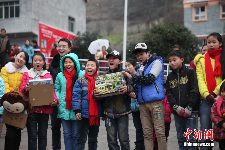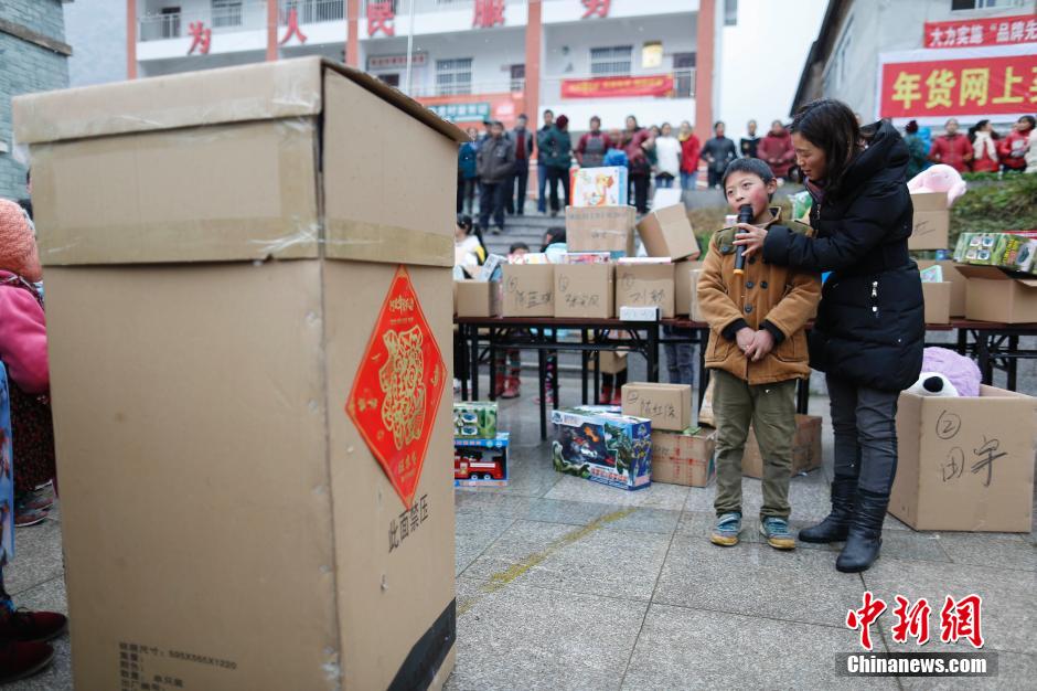 1月22日,四川省绵阳市北川县桃龙乡铁龙村举办留守儿童新年礼物发放活动。留守儿童李昂(化名)在活动现场收获“神秘礼物”——外出打工三年的父亲通过“快递”的方式将自己“运送”回孩子身边,以满足他盼望爸爸回家过年的愿望。据了解,此次活动由农村淘宝合伙人白丽与当地留守儿童学校教师共同发起,旨在为60余名留守儿童实现新年愿望。在愿望征集过程中,白丽和老师了解到李昂(化名)盼望父亲回家的心愿,故特意“策划”了一场惊喜,将李昂(化名)的父亲作为新年礼物“快递”到孩子身边。 中新社记者 王骏 摄