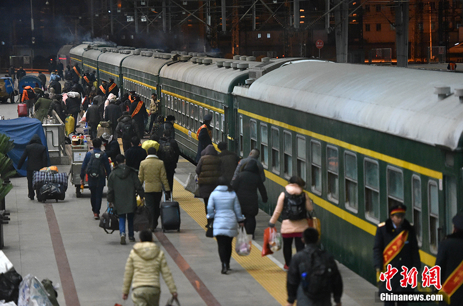 据悉,2016年春运期间,北京西站预计运送旅客1180万人(日均到发29.5万人),比2015年同期1123万人同比增长5.1%。与往年不同的是,候车区由南广场地面迁至北广场地下一层。设有北广场地面和北地下二层两个验证验票入口,旅客乘坐地铁出北出口或乘公交车到达北广场后,经两个临候区入口就近验证候车。图为大批乘客成乘坐临客。 中新网记者 金硕 摄