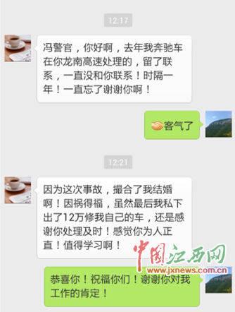 中国江西网讯“因为这次事故,撮合了我和对方的婚姻,因祸得福。。。。。?!?月23日,江西省公安厅交通管理局高速公路交警总队直属八支队第七大队民警冯伟收到一条当事人黄某发来的短信,告知他与事故另一名当事人李某已登记结婚。