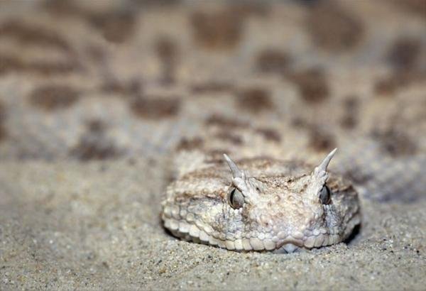 沙漠角蝰发现于中东和非洲北部地区,它每只眼睛上的小角让它很容易辨认。根据科学家所说这种蛇的毒性是不同的,它的毒性半数致死剂量范围从0.4毫克到0.1毫克,这种沙漠角蝰采用一种特别的运动方式,它把自己的压进沙中来穿行于松散的表面。我们忍不住想说的是这种蛇是一种恶魔般的毒蛇。