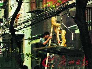 而在广州市海珠区江南西路青竹大街1号三楼也发生了这么一件事,一条长约4~5米,直径至少粗达20厘米,通体金黄的巨蟒盘踞窗台,蛇头摆来摆去,让人不寒而栗。经过一个多小时的“抓捕”行动,蟒蛇终于被乖乖地抬回家。据悉,怀疑是宠物蛇——黄金蟒,趁主人外出从窗户偷偷游了出来,惊吓到市民。