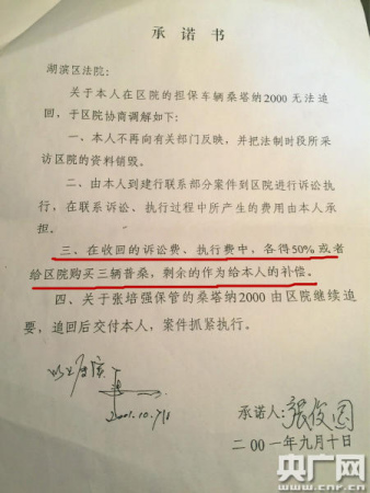 据中国之声《新闻纵横》报道,中国之声昨天报道了:河南三门峡市湖滨区人民法院为了弥补当事人担保车辆丢失的损失,与当事人签下承诺书,约定诉讼费、执行费五五分成,或当事人给法院购买三辆车。当事人张先生说,这是法院“公开受贿”、“公然卖法”,此后他给法院送车、送餐券、送赞助费,但是法院并没有履行承诺,导致自己和法院的“合伙生意”赔了本。