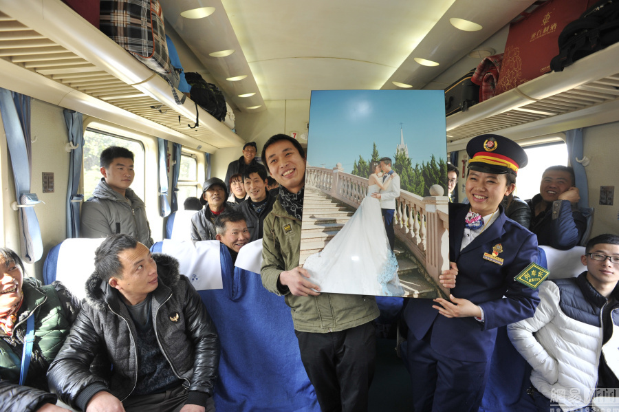 关键词:春运列车趣事 小伙 扛婚纱照回家
