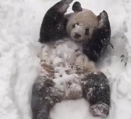 原标题:大熊猫玩雪视频走红 美国男子跟风穿熊猫服玩雪