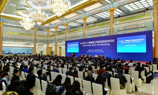 人民政协网北京1月26日电(记者 杜军玲)26日,2016年二十国集团工商界活动(B20)启动仪式在北京人民大会堂举行。中央政治局委员、国务院副总理汪洋出席启动仪式并发表重要讲话。来自二十国集团(G20)成员商协会、研究机构、知名企业以及有关国际组织和机构等的代表400多人参加。