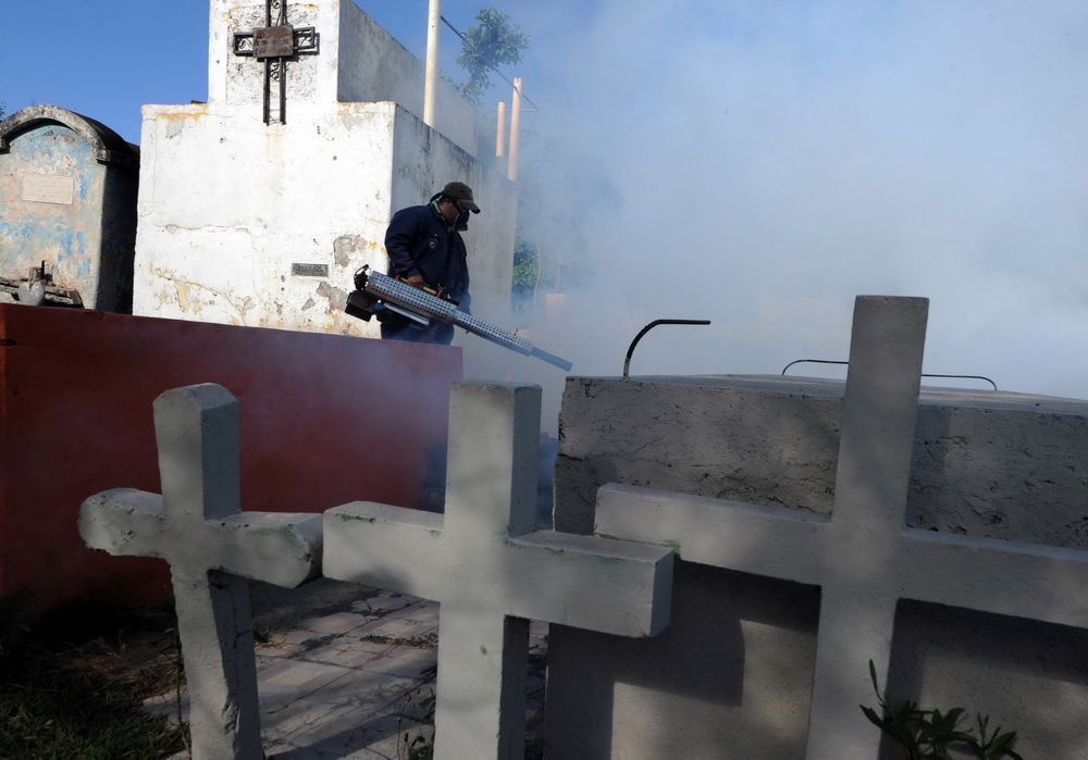 这是1月21日,在洪都拉斯首都特古西加尔巴,一名卫生部工作人员在一处公墓喷洒灭蚊药剂。