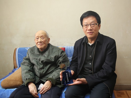 周老是《群言》杂志的首届编委会委员,也是《群言》的老作者,108岁高龄时还坚持为杂志撰稿。为感谢周老多年来对杂志的支持,民盟中央特在2015年《群言》杂志庆祝创刊30周年之际,为周老颁发了“群言特别致敬奖”。当张平副主席把奖杯和收录有周老文章的《群言文丛》送给他时,周老十分高兴,连声道谢。
