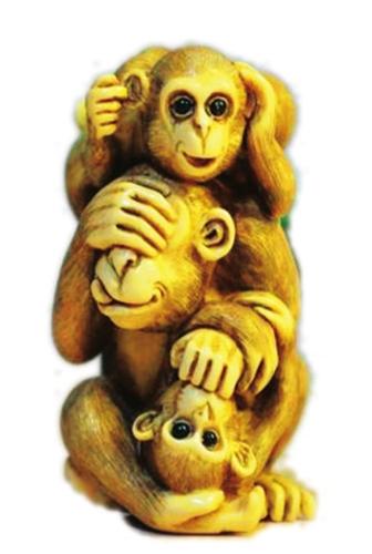 三不猴的造型有合体,也有单体,神情憨态可掬。一只猴用手捂着耳朵,另一只猴用手捂着嘴巴,还有一只猴用手蒙着眼睛,寓意不看、不听、不说,淋漓尽致地表现出谨慎善为、与世无争的处世心态。
